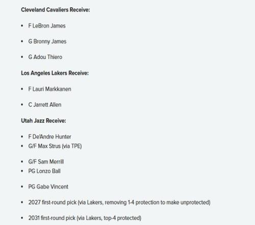 爵士得到:亨特、斯特魯斯、梅里爾、朗佐-鮑爾、文森特、湖人2027年首輪簽(移除前四順位保護(hù),變?yōu)闊o保護(hù)簽)、湖人2031年首輪簽(前四順位保護(hù))